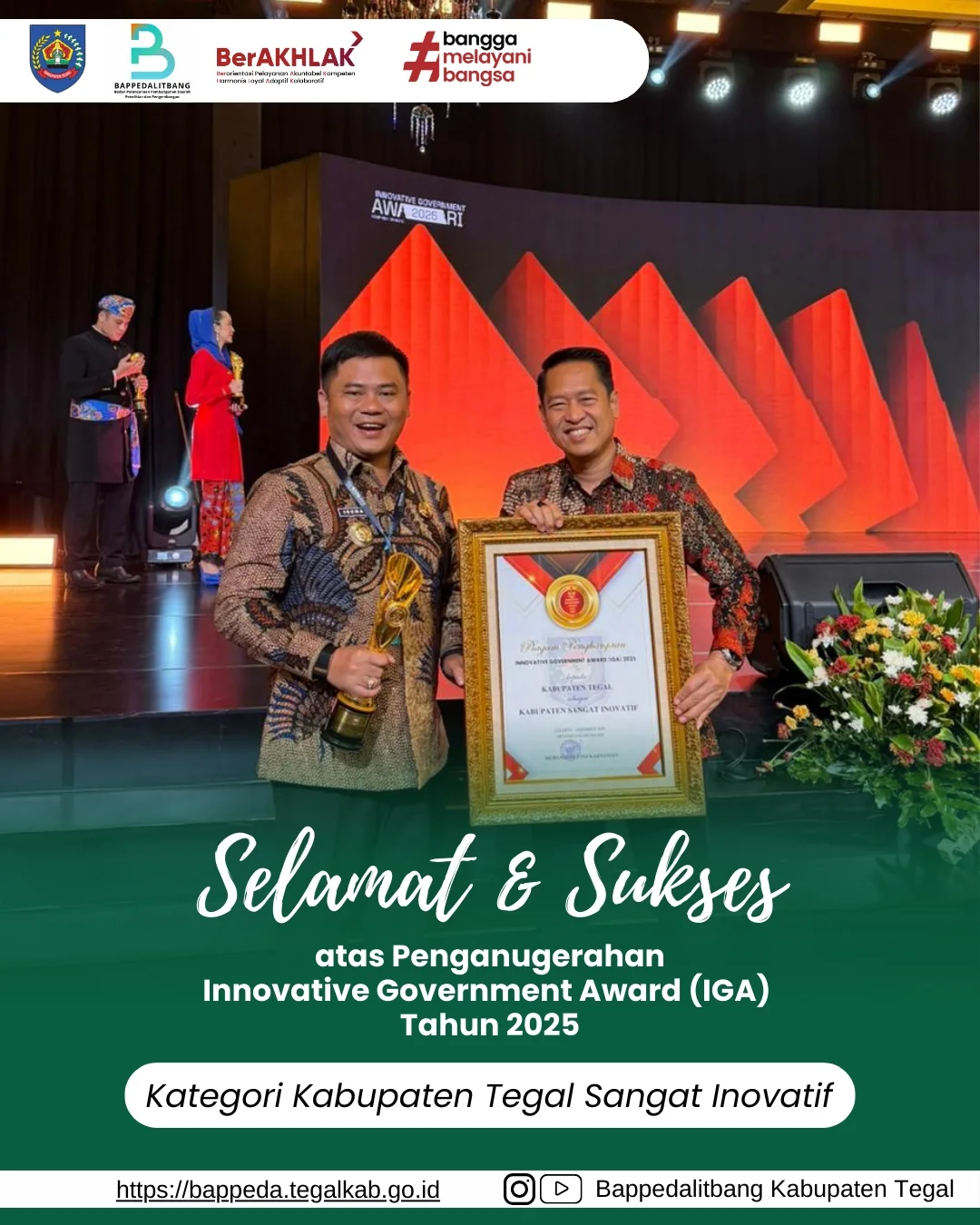 Kabupaten Tegal kembali menorehkan prestasi membanggakan. Enam tahun berturut-turut, kita berhasil meraih penghargaan Kabupaten Sangat Inovatif dalam ajang Innovative Government Award (IGA) dari Kemendagri. Penghargaan ini diterima langsung oleh Bupati Tegal, H. Ischak Maulana Rohman, S.H., didampingi Kepala Bappeda Litbang, Muhammad Faried Wajdy, S.Sos., M.Si, di Jakarta (10/12/2025).